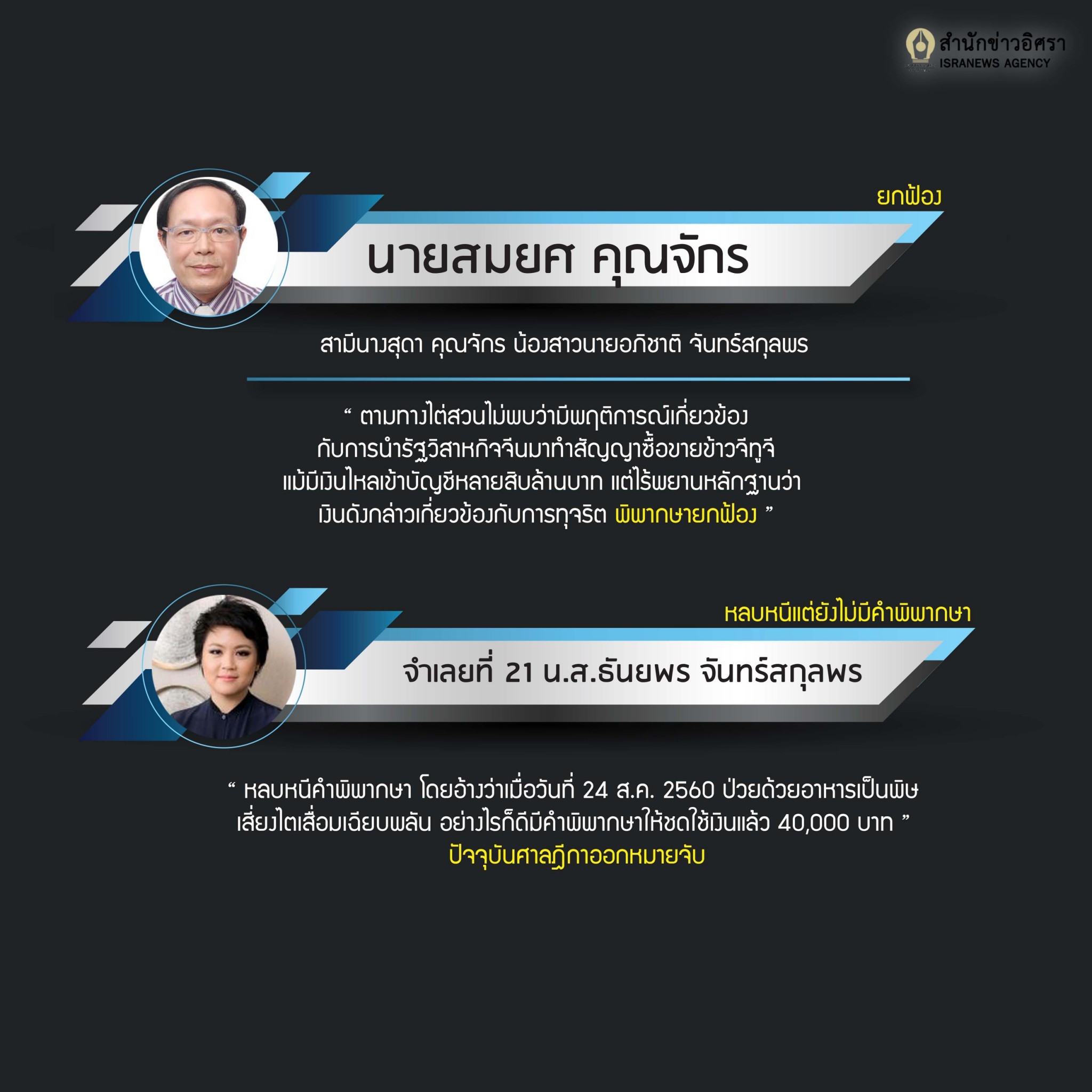 ศาลฎีกาฯพิพากษาคุก‘หมอโด่ง’50 ปี-‘สุธี’ 32 ปี ทุจริตข้าวจีทูจี-หลบหนีสั่งออกหมายจับ