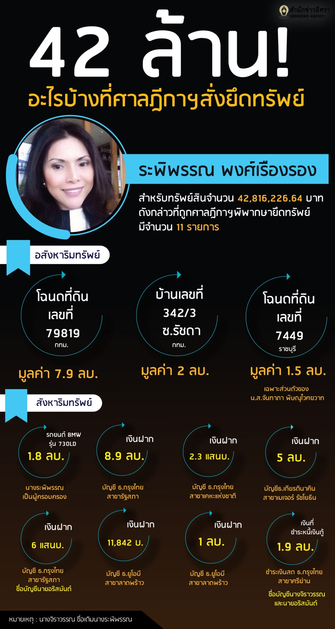 INFO : ทรัพย์สิน 42.8 ล้านบาทของนางระพิพรรณ ที่ถูกศาลฎีกาฯพิพากษายึดทรัพย์ คดีร่ำรวยผิดปกติ มีอะไรบ้าง ?