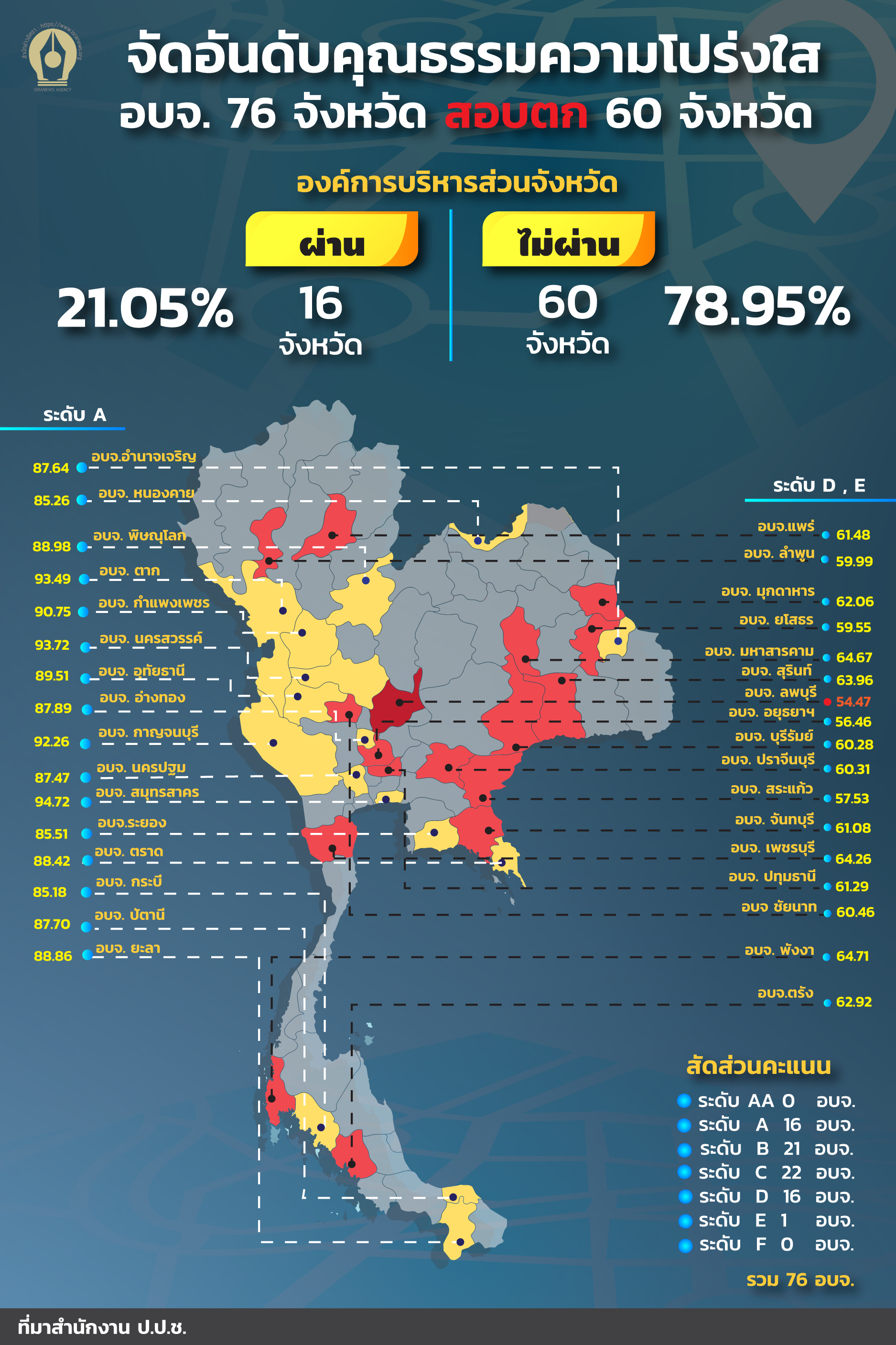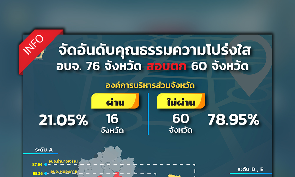 INFO : จัดอันดับคุณธรรมความโปร่งใส 63 อบจ. 76 จังหวัด สอบตก 60 จังหวัด องค์การบริหารส่วนจังหวัด (อบจ.) จำนวน 16 แห่งที่ผ่านเกณฑ์ฯ อบจ. คะแนนต่ำสุด อบจ.ลพบุรี 54.47 (เกรด E) , อบจ.พระนครศรีอยุธยา 56.46 (D) ,อบจ.สระแก้ว 57.53 (D) , อบจ.ยโสธร 59.55 (D) ,อบจ.ลำพูน 59.99 (D) ,อบจ.บุรีรัมย์ 60.28 (D)