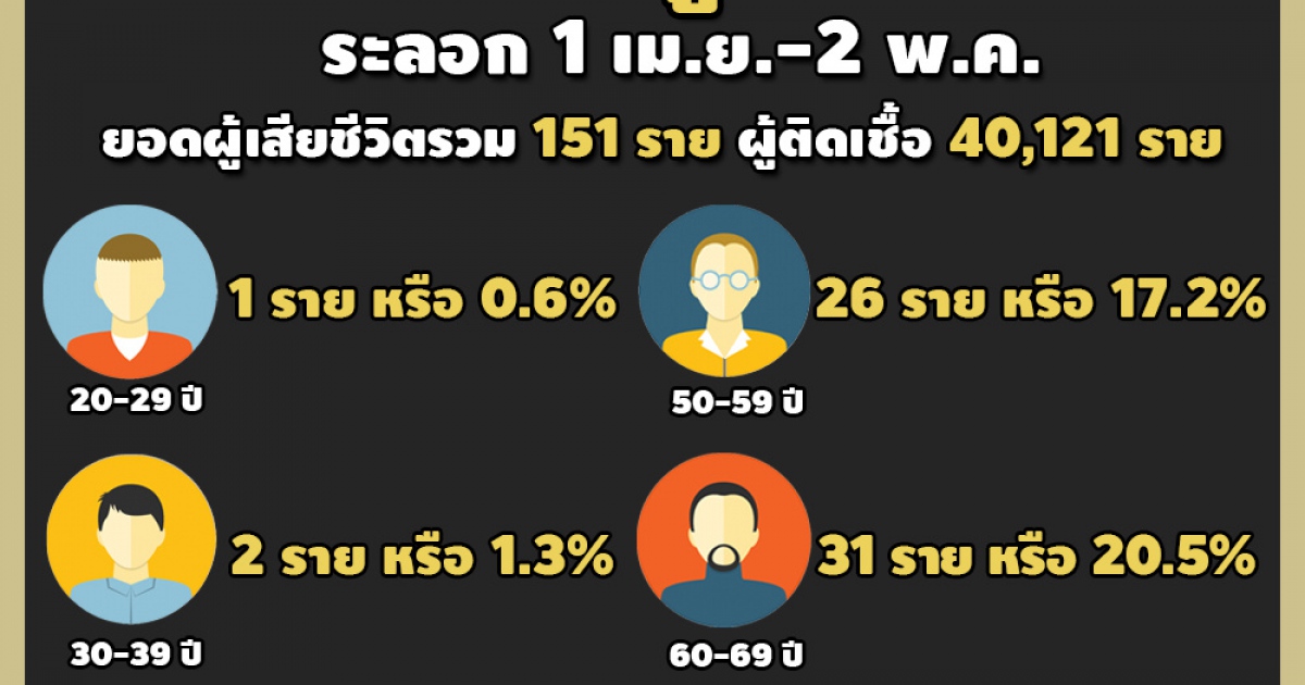 สำนักข่าวอิศรา (www.isranews.org) รายงาน สัดส่วนผู้เสียชีวิตจากโควิดระลอกใหม่ ระหว่างวันที่ 1 เม.ย. - 2 พ.ค.2564 พบผู้เสียชีวิตแล้ว 151 ราย โดยมีรายละเอียด ดังนี้