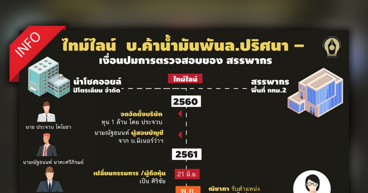อินโฟกราฟิกนี้ เป็นการเทียบเคียง ไทม์ไลน์ ในช่วงเวลาตั้งแต่ ปี 2560 ที่มีการจดทะเบียนจัดตั้งบริษัท นำโชคออยล์ ปิโตรเลียม จำกัด กับ ช่วงเวลาที่สำนักงานสรรพากรพื้นที่กรุงเทพฯ 2 เข้าไปตรวจสอบในปลายปี 2562 กระทั่งส่งหนังสือประเมินภาษีอากรเมื่อเดือน เม.ย.2564