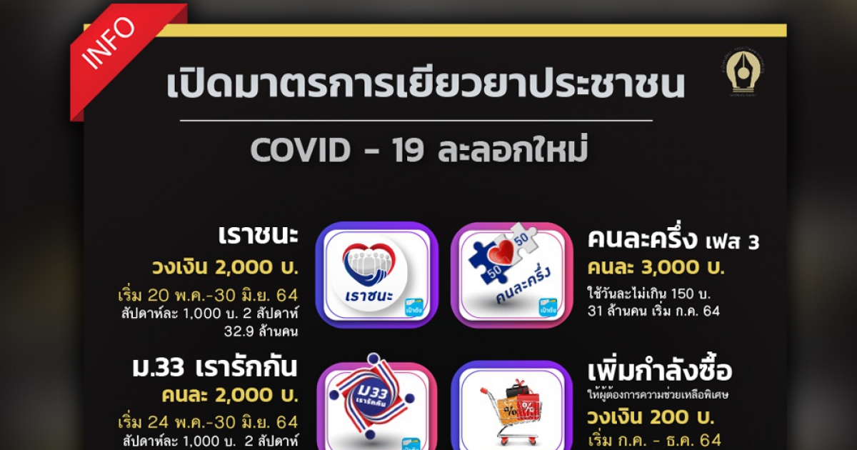 INFO : เปิดมาตรการเยียวยาประชาชน โควิด-19 ระลอกใหม่ ตามที่ประชุมคณะรัฐมนตรี(ครม.) ที่มีพล.อ.ประยุทธ์ จันทร์โอชา นายกรัฐมนตรี เป็นประธาน พิจารณาอนุมัติ
