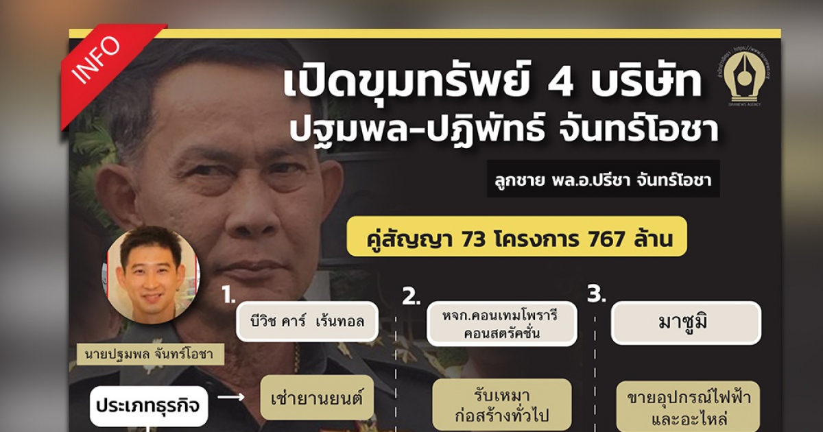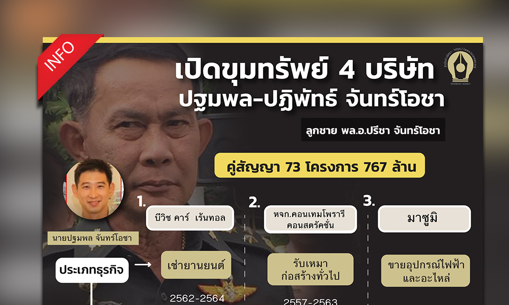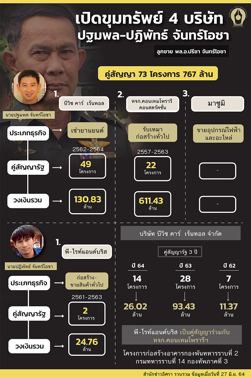 "...ในจำนวน 4 บริษัท/หจก.ข้างต้นของ นายปฐมพล-นายปฏิพัทธ์ จันทร์โอชา 2 พี่น้องบุตร พล.อ.ปรีชา พบว่ามีอย่างน้อย 3 แห่ง ที่เป็นคู่สัญญากับหน่วยงานของรัฐ และกองทัพ ได้แก่ หจก.คอนเทมโพรารี บริษัท , บีวิช คาร์ เร้นทอล จำกัด และ บริษัท พี-ไรท์แอนด์บริส จำกัด..."