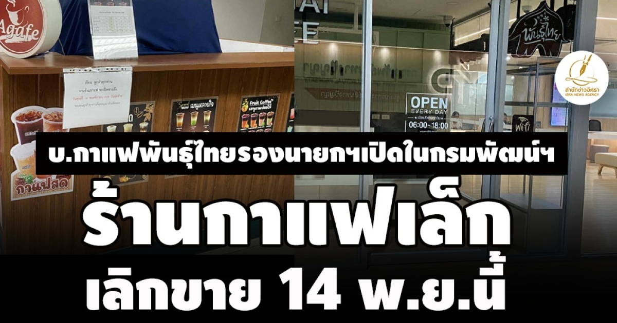 ร้านกาแฟ Agafe ขนาดเล็ก ในตึกกรมพัฒนาฯ/ทรัพย์สินทางปัญญา ก.พาณิชย์ สนามบินน้ำ แจ้งขายวันสุดท้าย 14 พ.ย.นี้ ขณะที่ บ.กาแฟพันธุ์ไทย ของรองนายกฯ พิพัฒน์ รัชกิจประการ ครอบครัว เตรียมเปิดแทน-รอชี้แจง