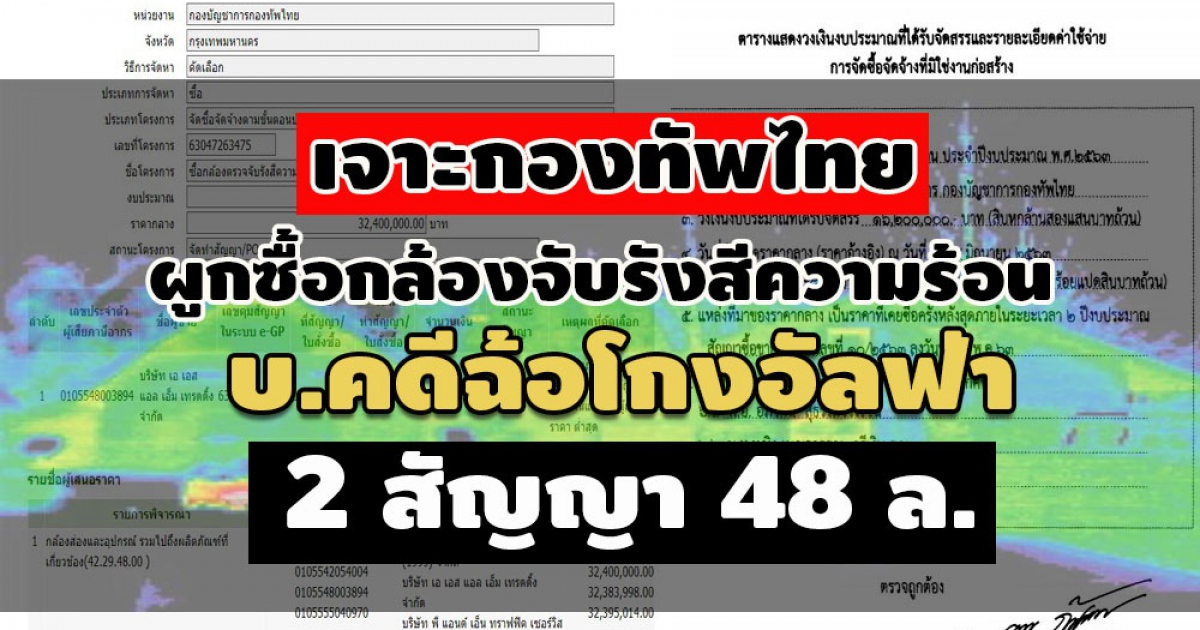 "...ในช่วงปี 2563 กองบัญชาการกองทัพไทย จัดซื้อกล้องตรวจจับรังสีความร้อน จาก บริษัท เอ เอส แอลเอ็มเทรดดิ้ง จำกัด จำนวน 2 สัญญา สัญญาแรก ลงนามวันที่ 29 พ.ค.2563 จัดซื้อด้วยวิธีการคัดเลือก วงเงิน 32,349,960 บาท สัญญาสอง ลงนามวันที่ 13 ส.ค. 63 จัดซื้อด้วยวิธีการเฉพาะเจาะจง 16,164,000 บาท อ้างอิงราคากลางจัดซื้อจากสัญญาแรก เท่ากับ บริษัท เอ เอส แอลเอ็มเทรดดิ้ง จำกัด ได้งานขายกล้องตรวจจับรังสีความร้อน ให้กับ กองบัญชาการกองทัพไทย จำนวน 2 สัญญา รวมวงเงิน 48,513,960 บาท ..."