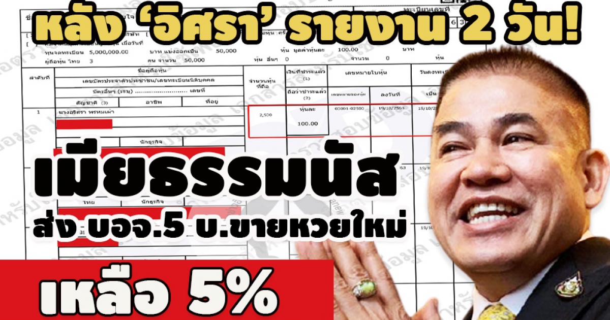 - เบ็ดเสร็จ 4 ครั้ง! ล่าสุด เมียธรรมนัส แก้ไข บอจ.5 บ.ขายหวยอีก 2 รอบ หลังถือหุ้นเกิน 5%