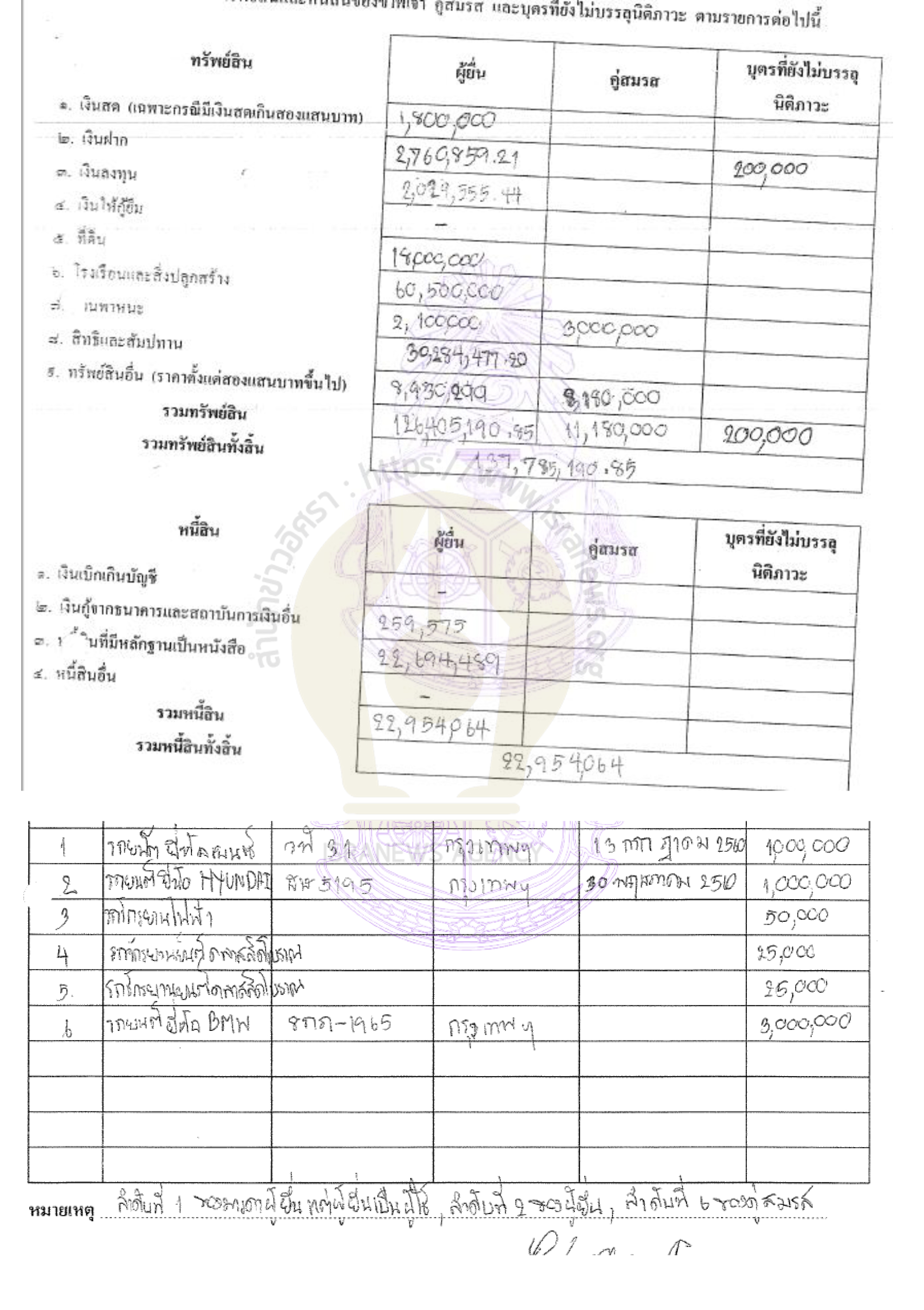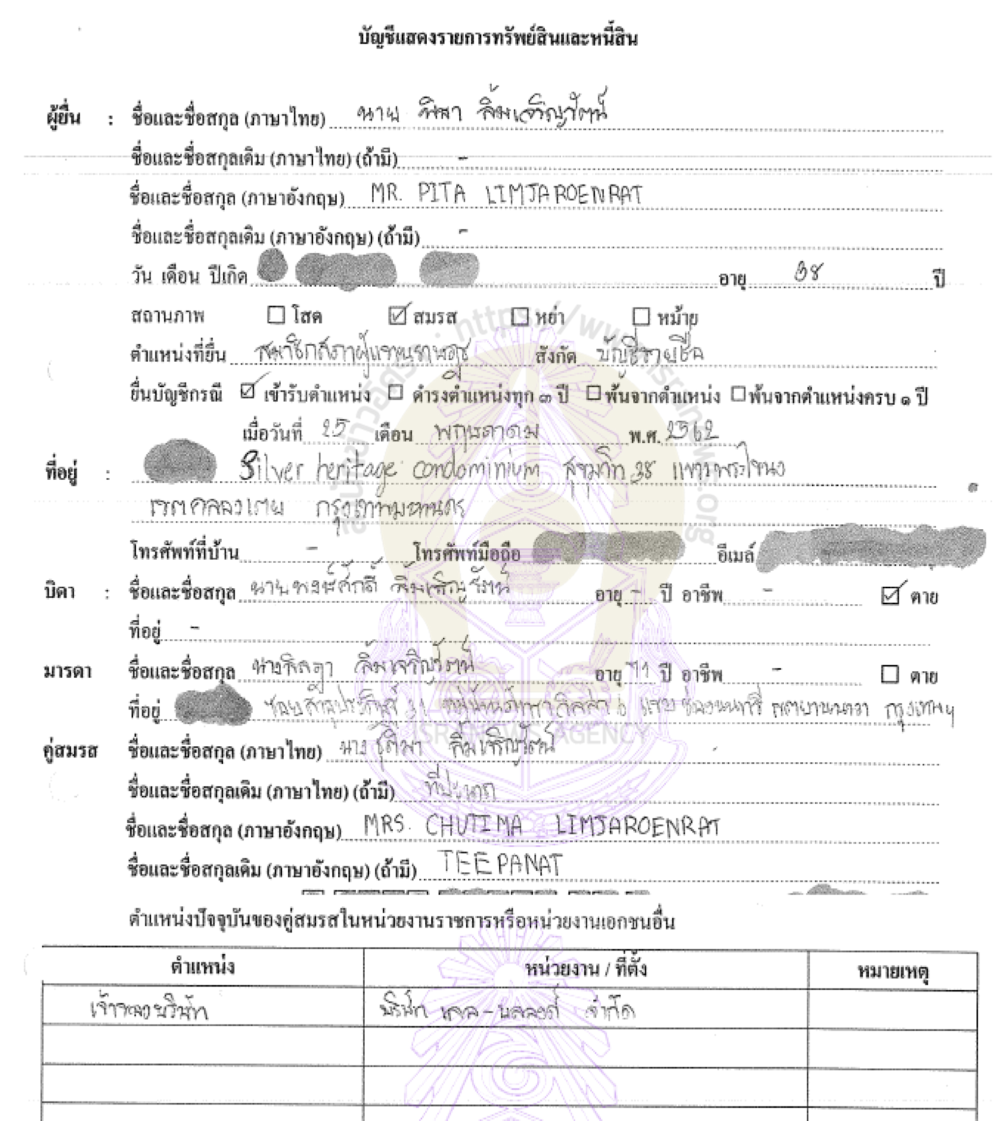 นายพิธายื่นบัญชีแสดงรายการทรัพย์สินและหนี้สินต่อคณะกรรมการ ป.ป.ช. ทรัพย์สิน 126,405,190.85 บาท (เงินลงทุน 2,029,555.44 บาท) หนี้สิน 22,954,064 บาท คู่สมรส 11,180,000 บาท (เฉพาะ ยานพาหนะ 3,000,000 บาท และทรัพย์สินอื่น 8,180,000 บาท) บุตรไม่บรรลุนิติภาวะ 200,000 บาท รวมทรัพย์สินทั้งสิ้น 137,785,190.55 บาท (ดูเอกสาร)