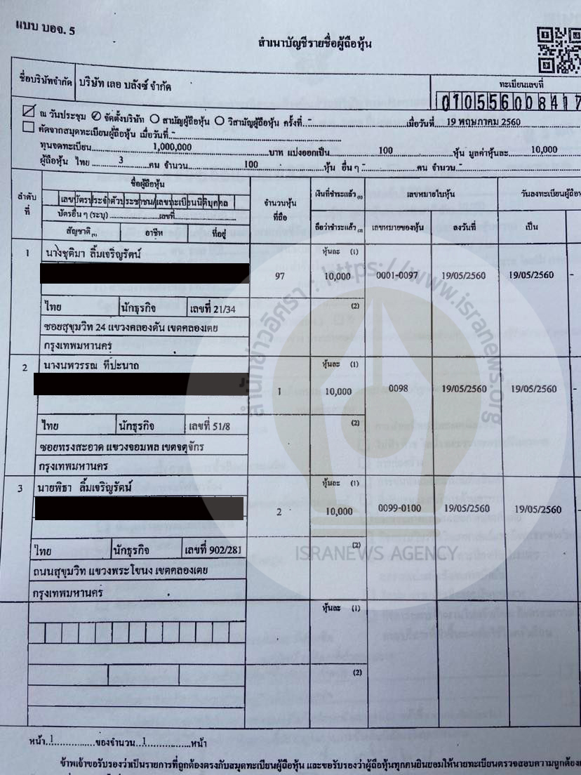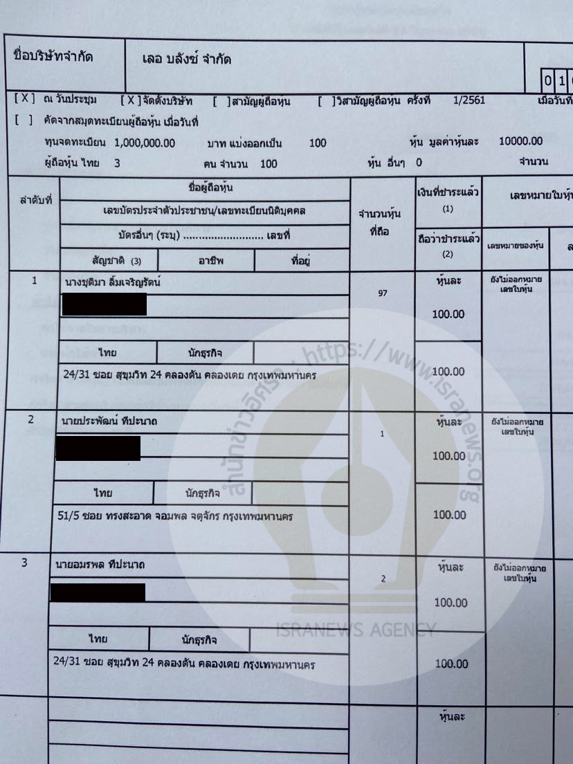 บัญชีรายชื่อผู้ถือหุ้น (บอจ.5) ณ วันที่ประชุมผู้ถือหุ้น 26 กรกฎาคม 2560 นางชุติมา ลิ้มเจริญรัตน์ 97 หุ้น นายอมรพล ทีปะนาถ 2 หุ้น นายประพัฒน์ ทีปะนาถ 1 หุ้น รวมหุ้นทั้งหมด 100 หุ้นมูลค่าหุ้นละ 1 บาท ไม่มีการเปลี่ยนแปลงจนถึงล่าสุด 30 เม.ย.2561 (นำส่งนายทะเบียนวันที่ 7 มิ.ย.2561) และยังไม่ได้จดทะเบียนเลิกกิจการ