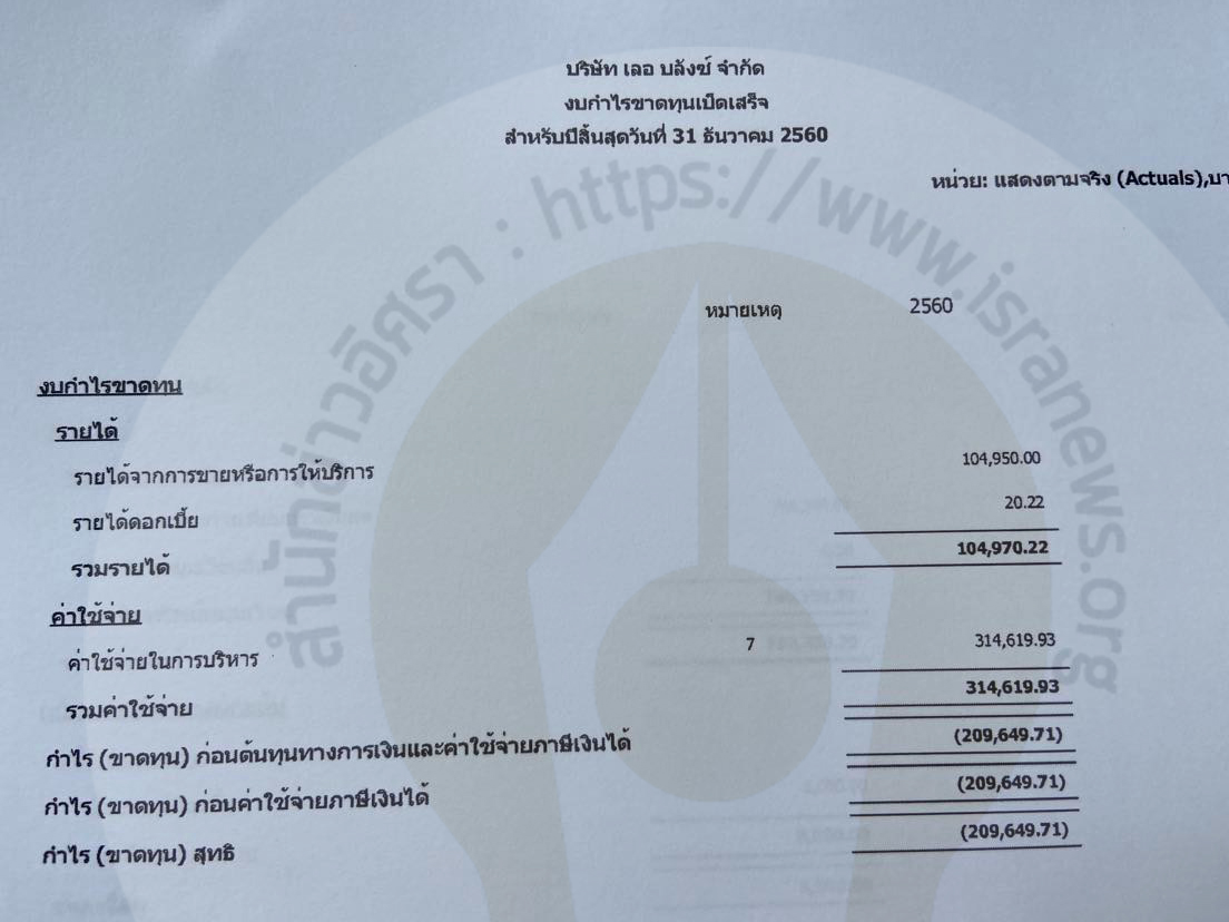 งบกำไรขาดทุน รายได้รวม 104,970.22 บาท ขาดทุนสุทธิ 209,649.71 บาท