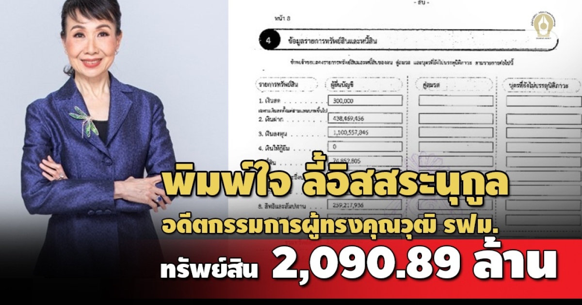 สำนักข่าวอิศรา (www.isranews.org) : เมื่อเร็วๆนี้ สำนักงานคณะกรรมการป้องกันและปราบปรามการทุจริตแห่งชาติ (ป.ป.ช.) เปิดเผยบัญชีทรัพย์สินและหนี้สินและเอกสารประกอบของผู้ดำรงตำแหน่งระดับสูง รายของนางพิมพ์ใจ ลี้อิสสระนุกูล กรณีพ้นจากตำแหน่งเจ้าหน้าที่ของรัฐ ในตำแหน่งกรรมการผู้ทรงคุณวุฒิ ของการรถไฟฟ้าขนส่งมวนแห่งประเทศไทย (รฟม.) เมื่อวันที่ 20 ก.ค. 2565