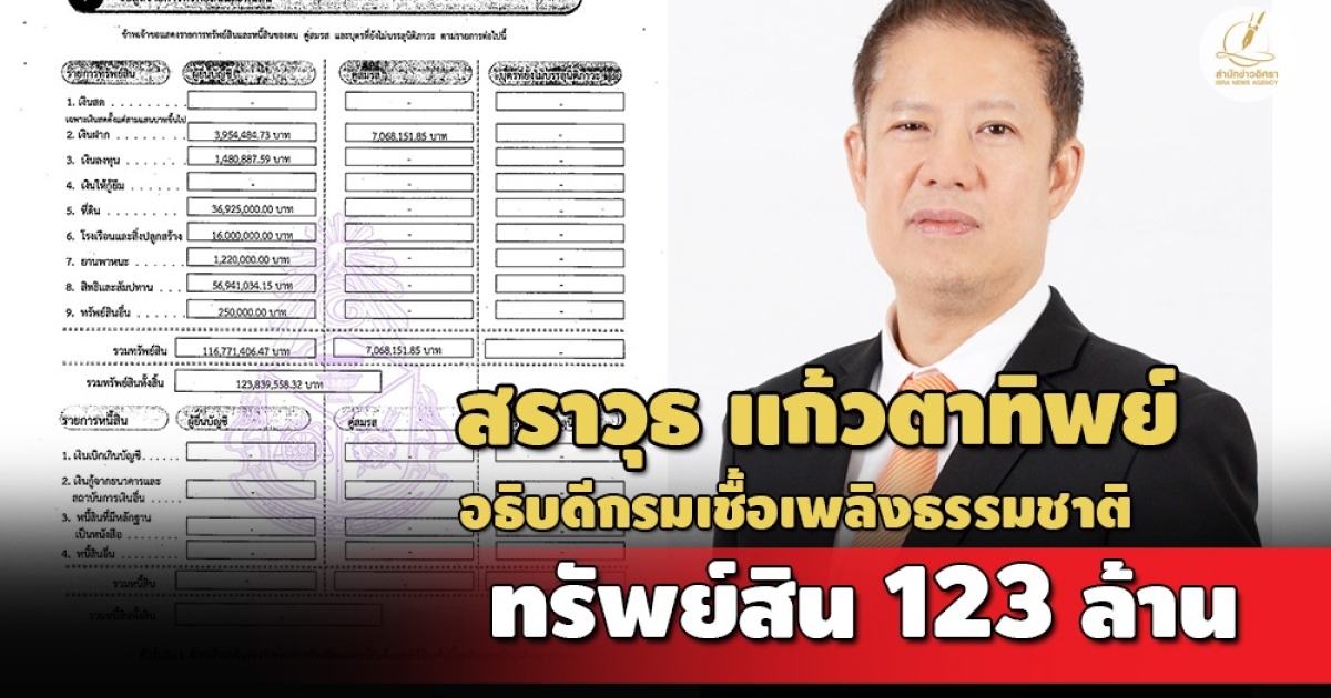 ป.ป.ช. เปิดบัญชีทรัพย์สิน 'สราวุธ แก้วตาทิพย์' อธิบดีกรมเชื้อเพลิงธรรมชาติ มีทรัพย์สิน 123 ล้าน ที่ดิน 4 แปลง 36 ล้าน ห้องชุด 2 ห้องในเขตปทุมวัน กทม. รายได้ 2.9 ล./ปี