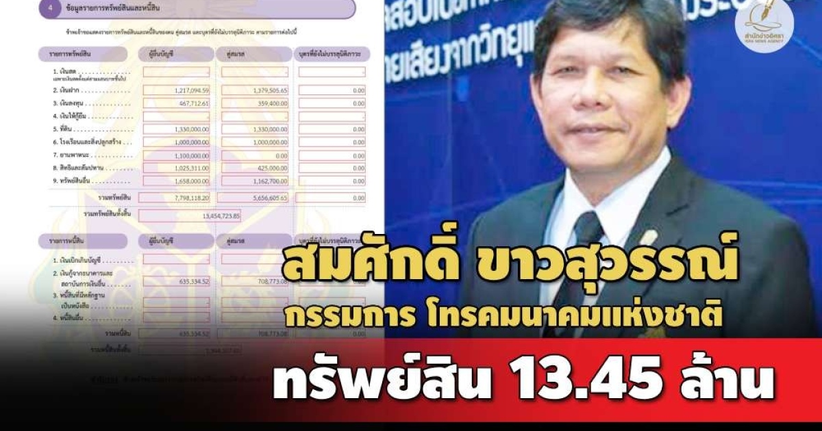ป.ป.ช. เปิดทรัพย์สิน 'สมศักดิ์ ขาวสุวรรณ์' กรรมการ โทรคมนาคมแห่งชาติ มีที่ดิน 2 แปลง บ้าน 2 หลัง รถยนต์ 3 คัน สะสมแหวน-นาฬิกาข้อมือ-สร้อยคอทองคำ รายได้ 2.5 ล./ปี