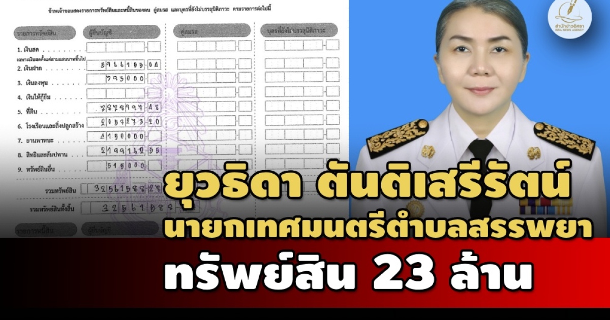 ป.ป.ช.เปิดทรัพย์สินองค์กรปกครองส่วนท้องถิ่น 'ยุวธิดา ตันติเสรีรัตน์' นายกเทศมนตรีตำบลสรรพยา มีทรัพย์สิน 23.56 ล. เงินฝาก 5 ล. ที่ดิน 15 แปลง 7.87 ล. รายได้ 4.27 แสน/ปี