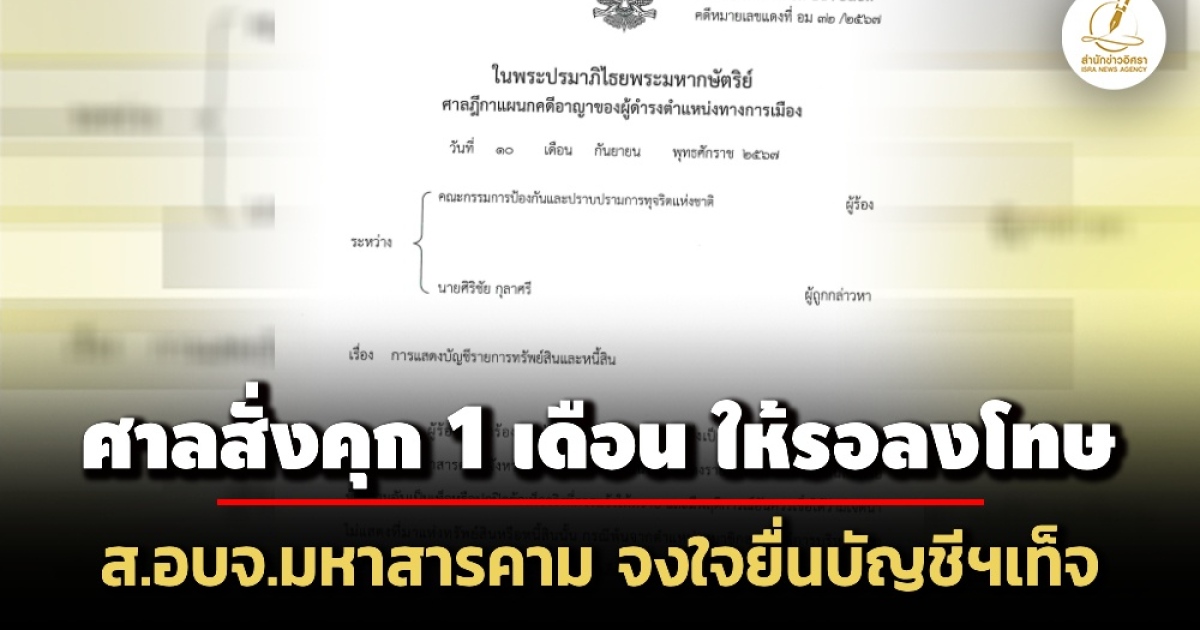 คำพิพากษาศาลฎีกา ‘ศิริชัย กุลาศรี’ สมาชิกสภา อบจ.มหาสารคาม จงใจยื่นบัญชีทรัพย์สินเท็จตอนพ้นตำแหน่ง ไม่แสดงโฉนดที่ดิน 1 แปลง 296,000 บาท ให้เพิกถอนสิทธิสมัครรับเลือกตั้งตลอดชีพ จำคุก 1 เดือน ปรับ 4,000 บาท รอลงโทษ 1 ปี