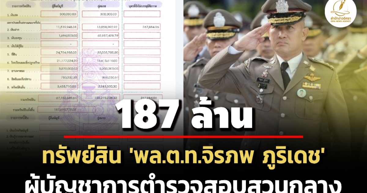 สำนักข่าวอิศรา (www.isranews.org) รายงานว่า เมื่อวันที่ 16 ม.ค. 2568 สำนักงานคณะกรรมการการป้องกันและปราบการทุจริตแห่งชาติ (ป.ป.ช.) เปิดเผยบัญชีแสดงรายการทรัพย์สินและหนี้สินผู้ดำรงตำแหน่งระดับสูง ราย พลตำรวจโท จิรภพ ภูริเดช กรรมการบริษัท ท่าอากาศยานไทย จำกัด (มหาชน) และกรรมการอิสระบริษัท ปตท.น้ำมันและการค้าปลีก จำกัด (มหาชน) กรณีทุกสามปีตลอดเวลาที่ยังดำรงตำแหน่งเป็นเจ้าหน้าที่ของรัฐ เมื่อวันที่ 1 ต.ค. 2567