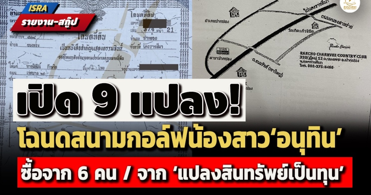 ISRA INVESTIGATIVE! ขุดลึกอีกลอต 9 แปลง โฉนดสนามกอล์ฟแรนโช ชาญวีร์ น้องสาว‘อนุทิน ชาญวีรกูล’ เจ้าของเดิม 6 คนแจ้งที่อยู่ในโคราชทั้งหมด เอกสารฯ 6 ฉบับ‘ออกตามนโยบายแปลงสินทรัพย์เป็นทุนรัฐบาล’ ขายให้ กก.ผู้ถือหุ้นใหญ่ ช่วงปี 2550 - 2552 ก่อนโอนทรัพย์สินบริษัทฯ พ.ย.2560