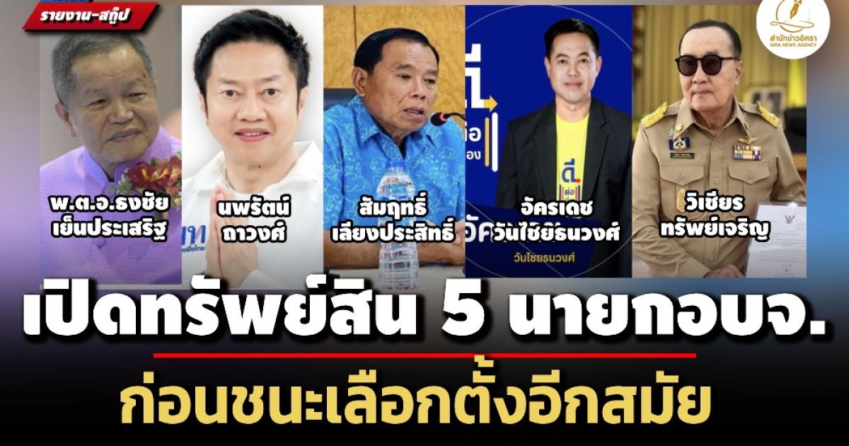 ป.ป.ช. เปิดทรัพย์สิน 5 นายกองค์การบริหารส่วนจังหวัด ก่อนชนะเลือกตั้งอีกสมัย 'พ.ต.อ.ธงชัย เย็นประเสริฐ' อบจ.นนทบุรี มากสุด 305 ล.-'วิเชียร ทรัพย์เจริญ' อบจ.ตราด 277 ล. 'สัมฤทธิ์ เลียงประสิทธิ์' อบจ.สตูล 64 ล.-'อัครเดช วันไชยธนวงศ์' อบจ.แม่ฮ่องสอน 31 ล.-'นพรัตน์ ถาวงศ์' อบจ.น่าน 4.7 ล.