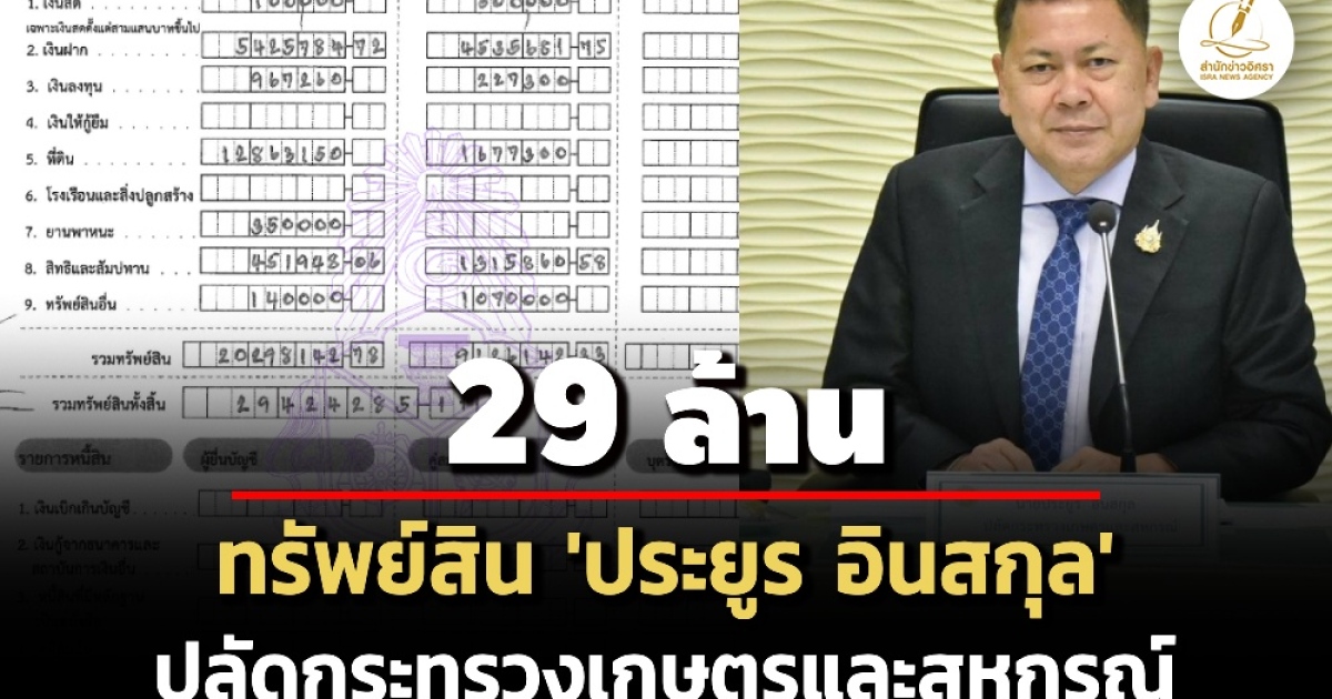 ป.ป.ช. เปิดทรัพย์สินผู้ดำรงตำแหน่งระดับสูง 'ประยูร อินสกุล' ปลัดกระทรวงเกษตรฯ ทรัพย์สิน 29 ล. รายได้ 4.7 ล./ปี-รับเงินงานบวชลูก 1.3 ล.