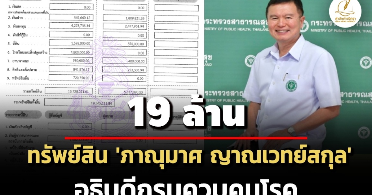 ป.ป.ช. เปิดทรัพย์สินผู้ดำรงตำแหน่งระดับสูง 'ภาณุมาศ ญาณเวทย์สกุล' อธิบดีกรมควบคุมโรค ทรัพย์สิน 19 ล. เงินลงทุน 4 ล. รายได้ 1.2 ล./ปี