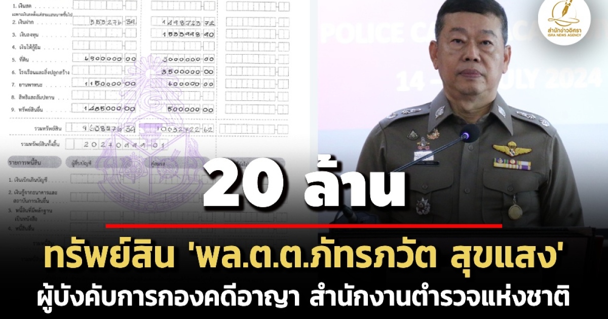 ป.ป.ช.เปิดทรัพย์สินผู้ดำรงตำแหน่งระดับสูง 'พล.ต.ต.ภัทรภวัต สุขแสง' ผู้บังคับการกองคดีอาญา สำนักงานตำรวจแห่งชาติ ทรัพย์สิน 20 ล. รายได้ 1.3 ล./ปี ไร้หนี้สิน