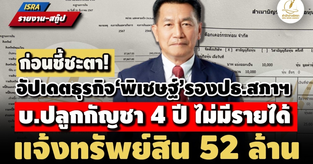 ก่อนชี้ชะตา! ตามอัปเดตธุรกิจปลูกกัญชา‘พิเชษฐ์ เชื้อเมืองพาน’ รอง ปธ.สภาฯ ผู้ติดบ่วงศาลรัฐธรรมนูญ ปมจัดงบฯ ผลปย.ทับซ้อน นัดตัดสิน 1 ส.ค. ล่าสุด บ.ดอกเตอร์กระท่อม 27 พ.ค.2568 ส่งงบการเงินรอบปี 2567 ยังไม่มีรายได้ หลังก่อตั้งมา 4 ปี ขณะที่แจ้ง ป.ป.ช.ทรัพย์สินปี 2566 พร้อมเมีย 52.3 ล. หนี้ 1.2 ล.
