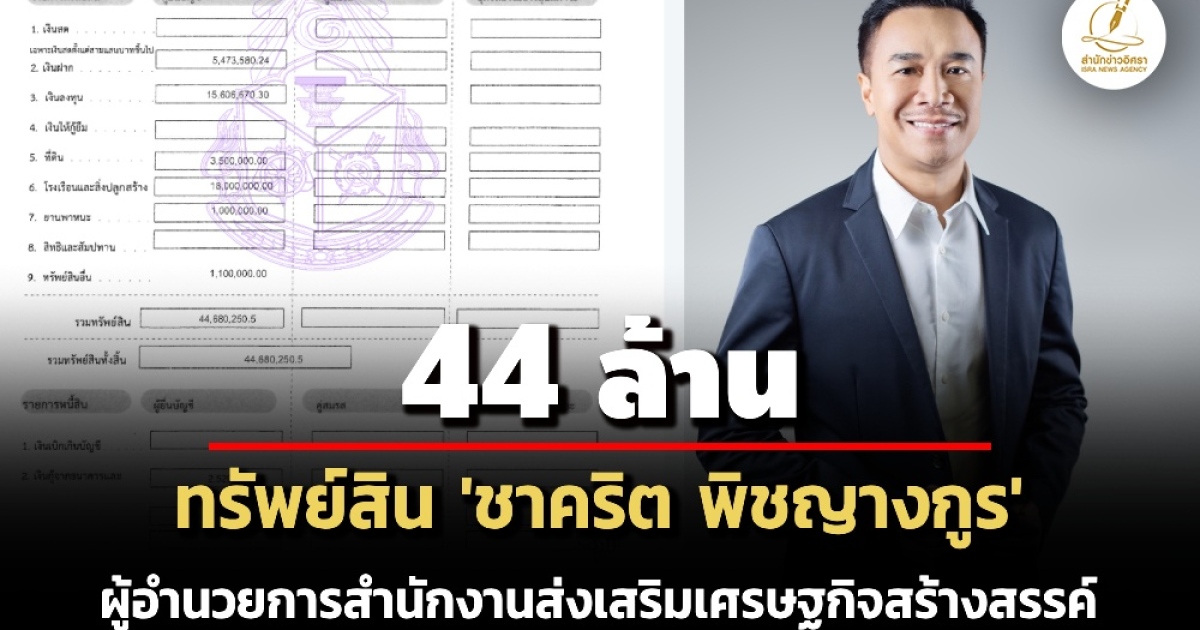สำนักข่าวอิศรา (www.isranews.org) รายงานว่า เมื่อเร็ว ๆ นี้ สำนักงานคณะกรรมการการป้องกันและปราบการทุจริตแห่งชาติ (ป.ป.ช.) เปิดเผยบัญชีแสดงรายการทรัพย์สินและหนี้สินผู้ดำรงตำแหน่งระดับสูง ราย นายชาคริต พิชญางกูร ผู้อำนวยการสำนักงานส่งเสริมเศรษฐกิจสร้างสรรค์ (องค์การมหาชน) กรณีทุกสามปีตลอดเวลาที่ยังดำรงตำแหน่งเป็นเจ้าหน้าที่ของรัฐ เมื่อวันที่ 17 พ.ค. 2568