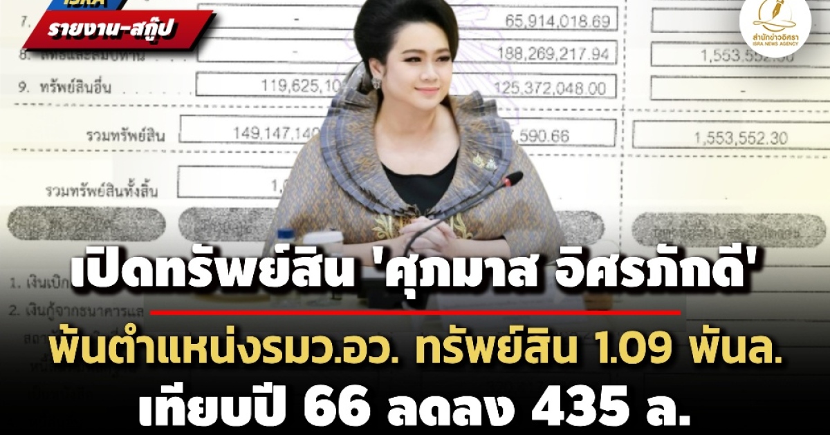 ป.ป.ช. เปิดทรัพย์สินรัฐมนตรี 'ศุภมาส อิศรภักดี' พ้นตำแหน่งรัฐมนตรีว่าการกระทรวงการอุดมศึกษา วิทยาศาสตร์ วิจัยและนวัตกรรม ทรัพย์สิน 1.09 พันล. เทียบปี 2566 ลดลง 435 ล.