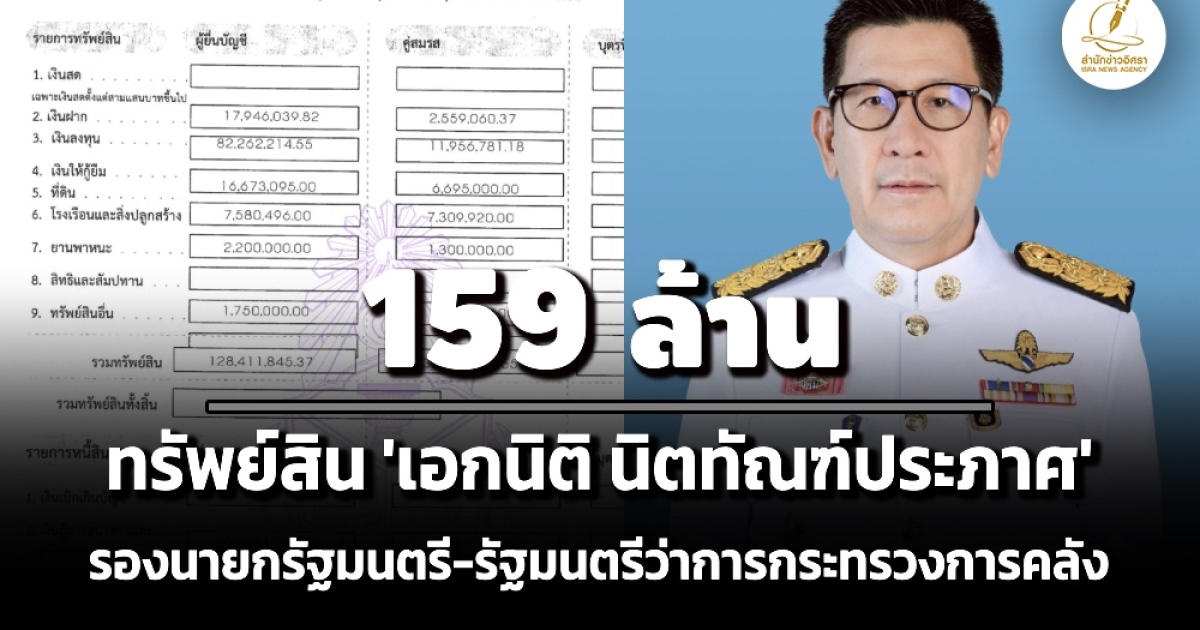ป.ป.ช. เปิดทรัพย์สินผู้ดำรงตำแหน่งระดับสูง 'เอกนิติ นิติทัณฑ์ประภาศ' รองนายกรัฐมนตรี-รมว.คลัง กรณีทุกสามปีที่ยังเป็นเจ้าหน้าที่รัฐ ทรัพย์สิน 159 ล. เงินลงทุน 82 ล. รายได้ 26.9 ล./ปี