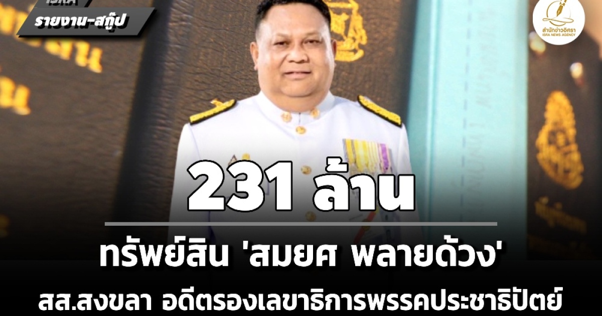 เปิดทรัพย์สินสมาชิกสภาผู้แทนราษฎร 'สมยศ พลายด้วง' สส.สงขลา อดีตรองเลขาธิการพรรคประชาธิปัตย์ หลังมีกระแสย้ายไปพรรคภูมิใจไทย ทรัพย์สิน 231 ล.-'โกถึก-ภรรยา' ไม่ปรากฏรายการเงินสด-เงินฝาก