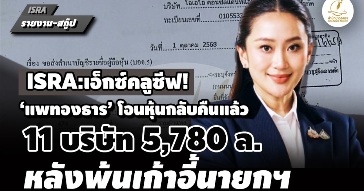 จากการตรวจสอบรายชื่อผู้ถือหุ้น ณ วันที่ 21 พ.ย. 2568 คงมีชื่อ นางสาวแพทองธารถือครอง 5,000,000 หุ้น กระนั้นไม่มีข้อมูลโอนกลับมาแล้วหรือไม่เช่นกัน
