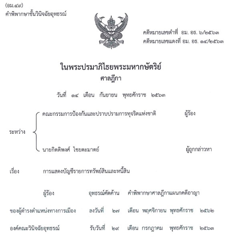 ผู้ร้องอุทธรณ์คัดค้าน คําพิพากษาศาลฎีกาแผนกคดีอาญาของผู้ดํารงตําแหน่งทางการเมือง ลงวันที่ 27 เดือน พฤศจิกายน พุทธศักราช 2562 องค์คณะวินิจฉัยอุทธรณ์ รับวันที่ 29 เดือน กรกฎาคม พุทธศักราช 2563