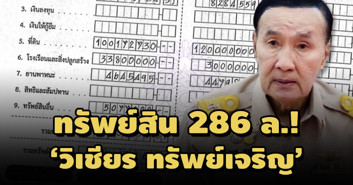 ทรัพย์สินรวม 286 ล้าน! ‘วิเชียร ทรัพย์เจริญ’ นายก อบจ.ตราดสมัย 5 ทำธุรกิจ ‘เหลายา พาราไดซ์ ไอซ์แลนด์ รีสอร์ท’ ที่ดิน 48 แปลง 100 ล้าน สร้อยทอง 16 เส้น หนักรวม 82 บาท มูลค่า 1 ล้านเศษ ‘คู่สมรส’ ที่ดิน จ.ตราด 1 แปลง 14 ไร่ 120 ล้าน