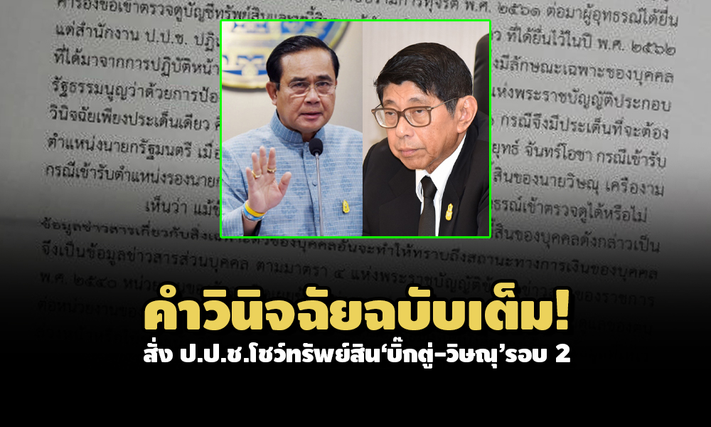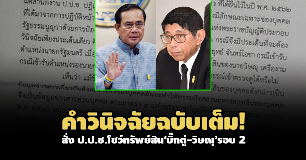 ข้อเท็จจริงรับฟังได้ว่า พล.อ.ประยุทธ์ ยื่นบัญชีทรัพย์สินกรณีเข้ารับตำแหน่งนายกรัฐมนตรี และนายวิษณุ ยื่นบัญชีทรัพย์สินกรณีเข้ารับตำแหน่งรองนายกรัฐมนตรี เมื่อวันที่ 4 ก.ย. 2557 (คณะรัฐมนตรี พล.อ.ประยุทธ์ 1) โดยคณะกรรมการ ป.ป.ช. เปิดเผยบัญชีทรัพย์สินเป็นการทั่วไป