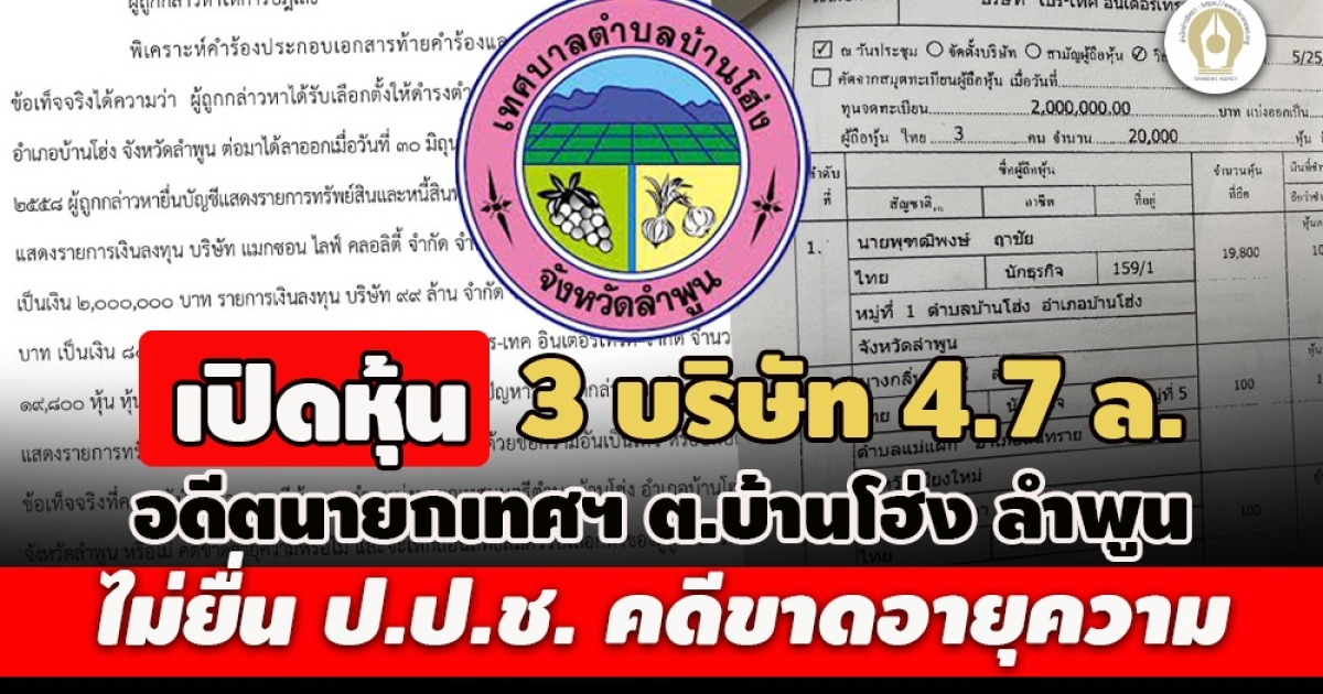 เปิดข้อมูลเงินลงทุน 3 แห่ง 4.7 ล้าน ‘พุฑฒิพงษ์ ฤาชัย’ นายกเทศมนตรีตําบลบ้านโฮ่ง จ. ลําพูน ไม่ยื่นแสดง ป.ป.ช. กรณีพ้นตําแหน่ง ทำธุรกิจรับเหมา ถือหุ้นช่วงปลายปี 2557 โอนปี 2558 ก่อนศาลฎีกาฯยกคำร้อง เหตุคดีขาดอายุความ