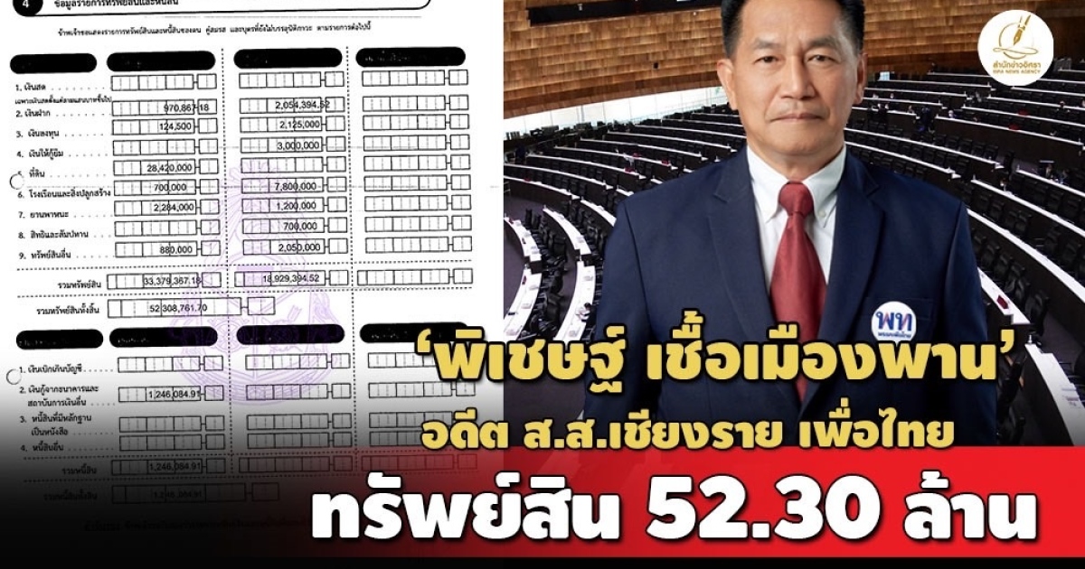 ป.ป.ช.เปิดบัญชีทรัพย์สิน 'พิเชษฐ์ เชื้อเมืองพาน' กรณีพ้นตำแหน่ง ส.ส.เชียงราย พรรคเพื่อไทย ทรัพย์สินกว่า 52 ล. มีหุ้นบจ.ด็อกเตอร์กระท่อม ที่ดินในเชียงราย-ปทุมธานี-กทม. สะสมพระเครื่อง-แหวน
