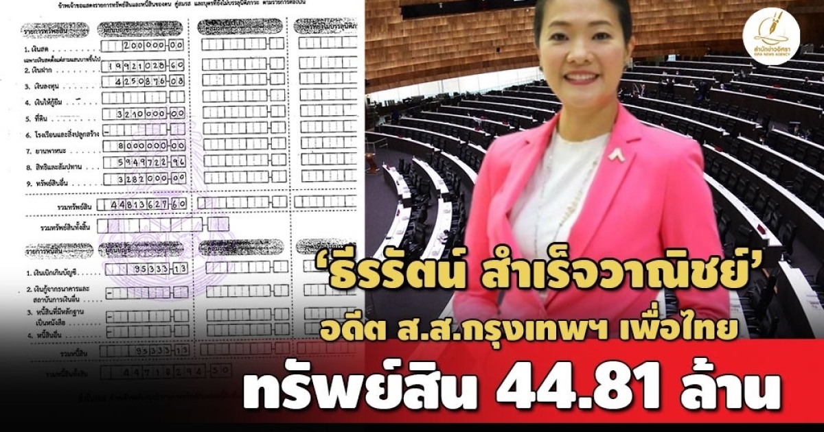 ป.ป.ช.เปิดบัญชีทรัพย์สิน 'ธีรรัตน์ สำเร็จวาณิชย์' กรณีพ้นตำแหน่ง ส.ส.กรุงเทพฯ พรรคเพื่อไทย ทรัพย์สินกว่า 44 ล. มีที่ดินในลาดกระบัง กทม. มีรถยนต์ 2 คัน สะสมนาฬิกา-อาวุธปืน-สร้อยคอทองคำ-เขี้ยวเสือหลวงพ่อปาน-กระเป๋าแบรนด์เนม รายได้ 2.4 ล./ปี