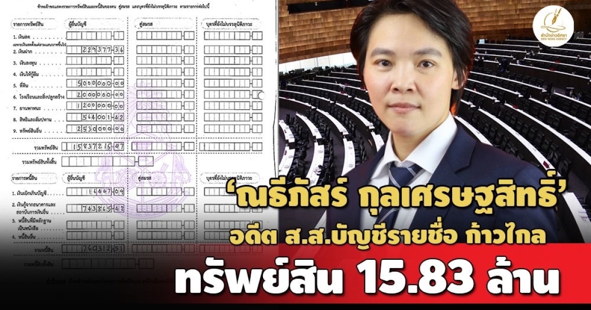 ป.ป.ช.เปิดบัญชีทรัพย์สิน 'ณธีภัสร์ กุลเศรษฐสิทธิ์' กรณีพ้นตำแหน่ง ส.ส.บัญชีรายชื่อ พรรคก้าวไกล ทรัพย์สินกว่า 15 ล. มีเงินลงทุน 52 รายการ ทองรูปพรรณ-แหวน-ทองคำแท่ง-นาฬิกา รายได้ 1.5 ล./ปี