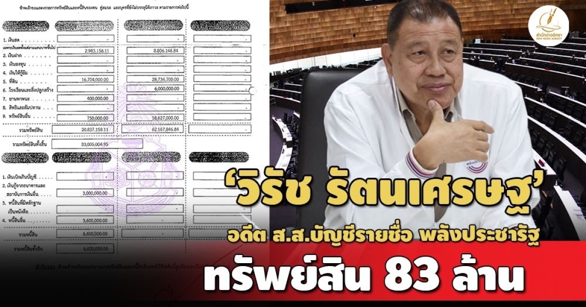 ป.ป.ช.เปิดบัญชีทรัพย์สิน 'วิรัช รัตนเศรษฐ' กรณีพ้นตำแหน่ง ส.ส.บัญชีรายชื่อ พรรคพลังประชารัฐ ทรัพย์สินกว่า 83 ล. มีที่ดินในโคราช สะสมนาฬิกา-พระเครื่อง-ปากกา-ทองรูปพรรณหนัก 150 บาท