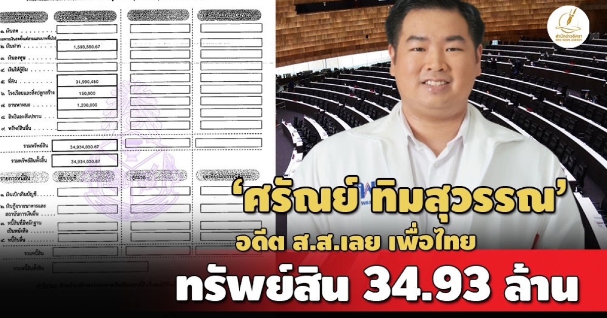 ป.ป.ช.เปิดบัญชีทรัพย์สิน 'ศรัณย์ ทิมสุวรรณ' กรณีพ้นตำแหน่ง ส.ส.เลย พรรคเพื่อไทย ทรัพย์สินกว่า 34 ล. มีที่ดิน 29 แปลงใน จ.เลย รวม 444 ไร่ รายได้ 1.3 ล./ปี ไร้หนี้สิน