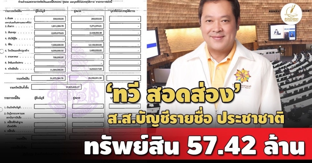 โดย พ.ต.อ.ทวี พร้อมนางสุนีย์ สอดส่อง คู่สมรส แจ้งมีทรัพย์สินทั้งสิ้น 57,425,626 บาท ไร้หนี้สิน