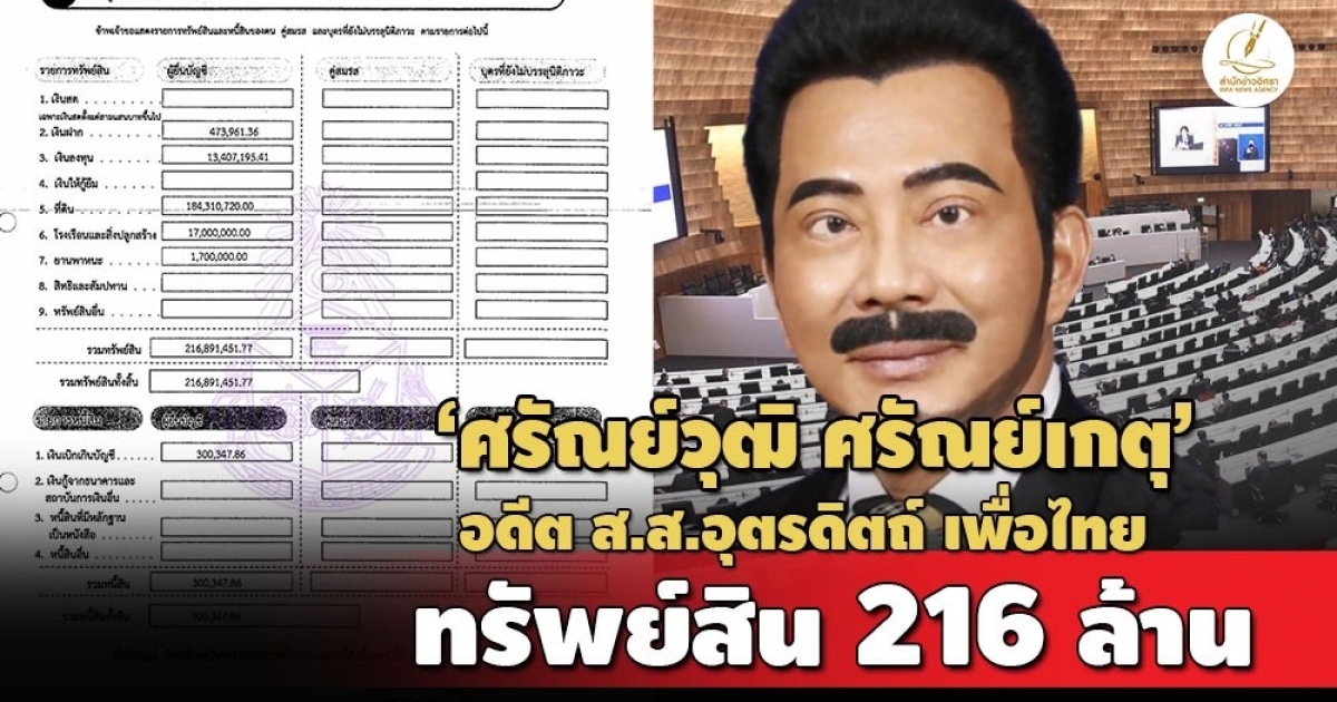 ป.ป.ช.เปิดบัญชีทรัพย์สิน 'ศรัณย์วุฒิ ศรัณย์เกตุ' กรณีพ้นตำแหน่ง ส.ส.อุตรดิตถ์ พรรคเพื่อไทย ทรัพย์สินกว่า 216 ล้าน เพิ่มจากปี 62 ก่อนเข้ารับตำแหน่ง 5 ล้านบาท