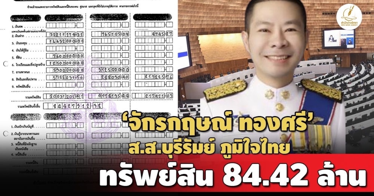 ป.ป.ช.เปิดบัญชีทรัพย์สิน 'จักรกฤษณ์ ทองศรี' ส.ส.บุรีรัมย์ พรรคภูมิใจไทย ทรัพย์สินกว่า 84 ล. พบถือ ITV. 40,000 หน่วย มีที่ดินใน บุรีรัมย์-นนทบุรี รายได้ 5.8 ล./ปี เจ้าตัวยังไม่ชี้แจง ขอดูรายละเอียดก่อน