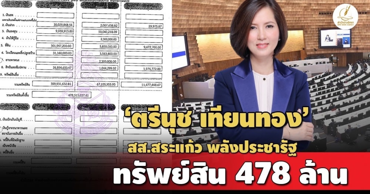ป.ป.ช.เปิดบัญชีทรัพย์สิน 'ตรีนุช เทียนทอง' กรณีพ้นตำแหน่ง สส.สระแก้ว พรรคพลังประชารัฐ ทรัพย์สินกว่า 478 ล้าน มีเงินฝาก 30 ล้าน ที่ดิน 41 แปลง รายได้ 1.6 ล./ปี