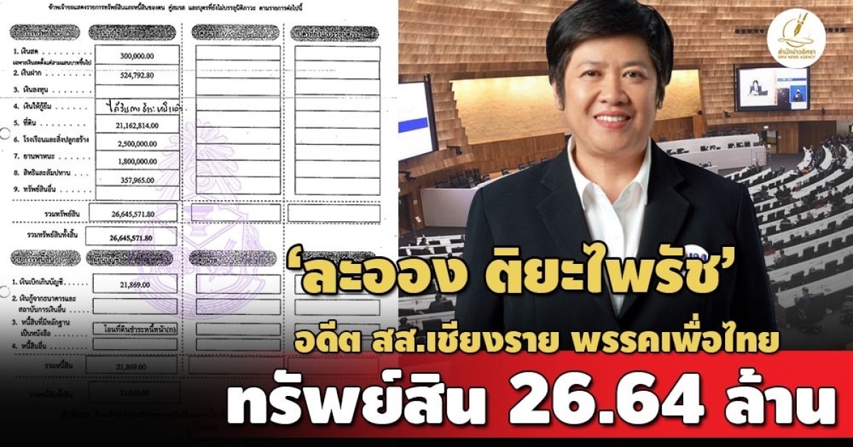 ป.ป.ช.เปิดบัญชีทรัพย์สิน 'ละออง ติยะไพรัช' กรณีพ้นตำแหน่ง สส.เชียงราย พรรคเพื่อไทย ทรัพย์สินกว่า 26 ล้าน มีที่ดิน 17 แปลงในเชียงราย-พะเยา รายได้ 1.5 ล./ปี