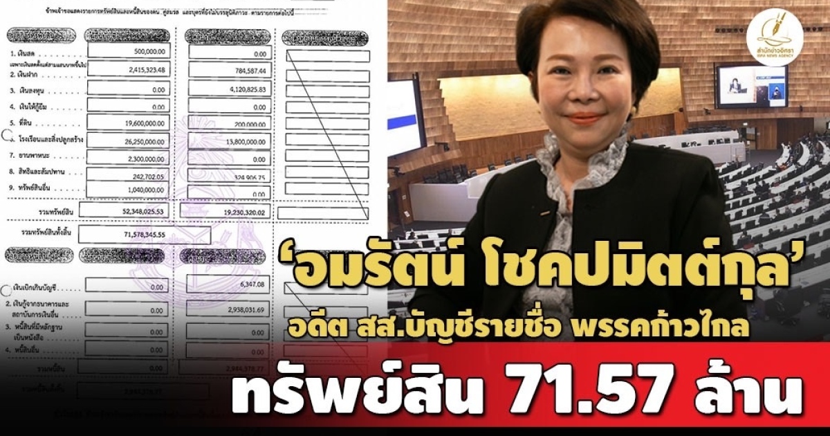 ป.ป.ช.เปิดบัญชีทรัพย์สิน 'อมรัตน์ โชคปมิตต์กุล' กรณีพ้นตำแหน่ง สส.บัญชีรายชื่อ พรรคก้าวไกล ทรัพย์สินกว่า 71 ล้าน มีที่ดิน 9 แปลง บ้าน 8 หลัง รถยนต์ 3 คัน กระเป๋ามือสตรี 4 ใบ รายได้ 1.4 ล./ปี