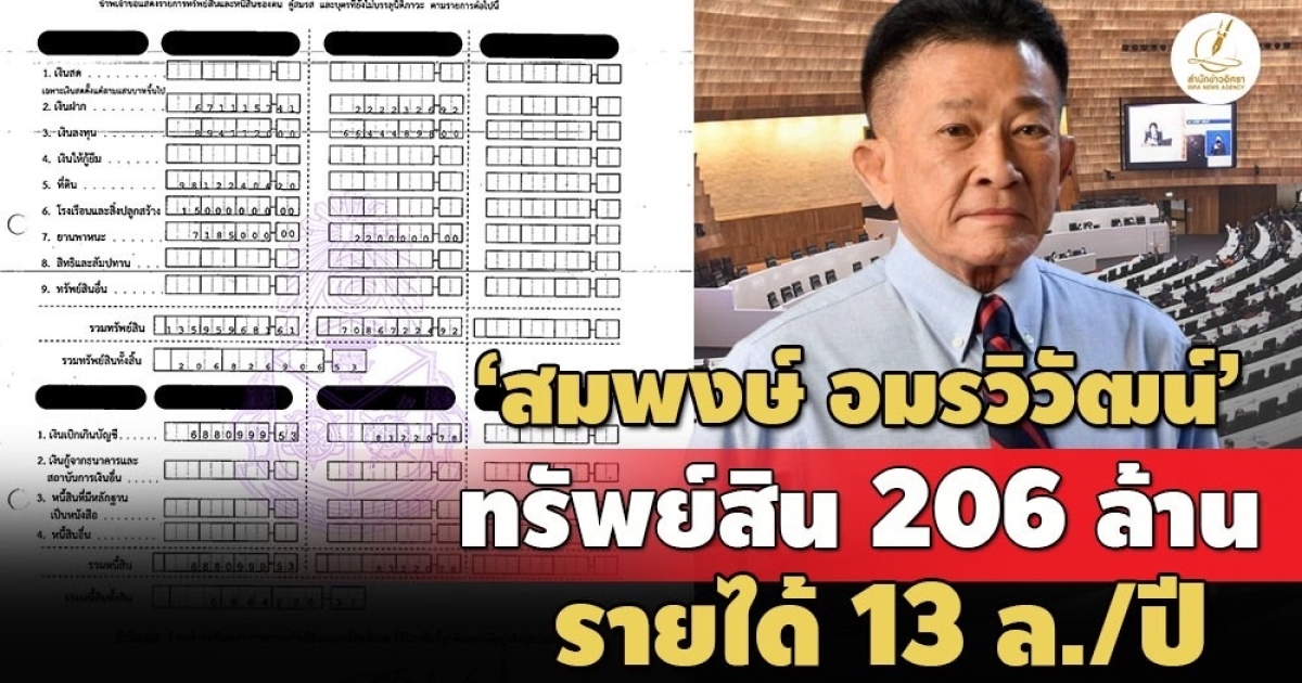 ป.ป.ช.เปิดบัญชีทรัพย์สิน 'สมพงษ์ อมรวิวัฒน์' กรณีพ้นตำแหน่ง สส.เชียงใหม่ พรรคเพื่อไทย ยุครบ.บิ๊กตู่ ปัจจุบันเป็นสส.บัญชีรายชื่อ มีทรัพย์สินกว่า 206 ล้าน ที่ดิน 47 แปลง บ้าน 2 หลัง รายได้ 13 ล./ปี
