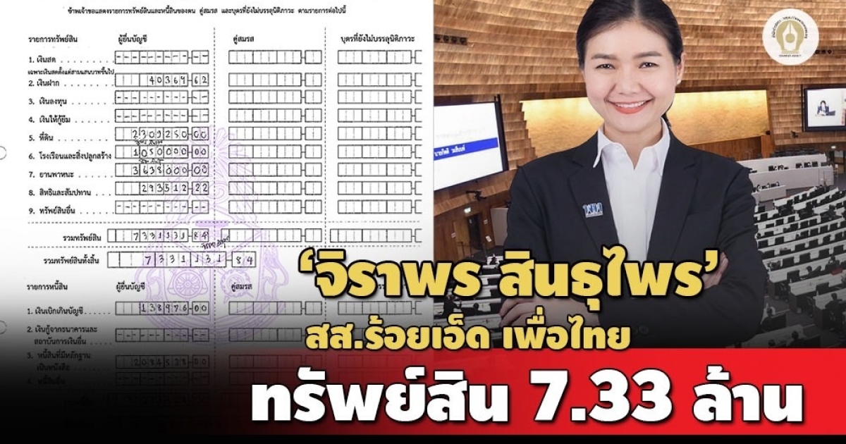 โดย น.ส.จิราพร แจ้งมีทรัพยฺสินทั้งสิ้น 7,331,131 บาท ประกอบด้วย เงินฝาก 40,369 บาท ทั้งหมด 3 บัญชี
