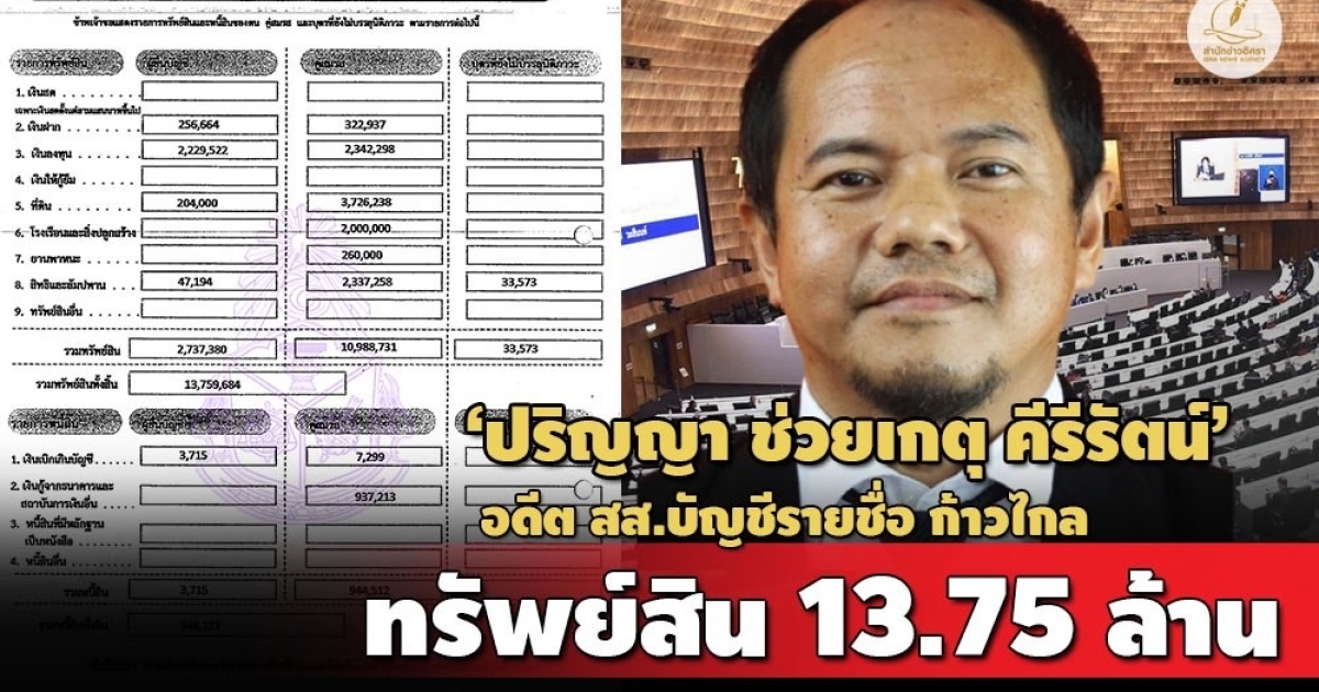 โดย นายปริญญา พร้อมด้วย น.ส.ขนิษฐา สีสุข ผู้อยู่กินฉันสามีภริยา และบุตรที่ยังไม่บรรลุนิติภาวะ แจ้งมีทรัพย์สินทั้งสิ้น 13,759,684 บาท หนี้สิน 948,227 บาท