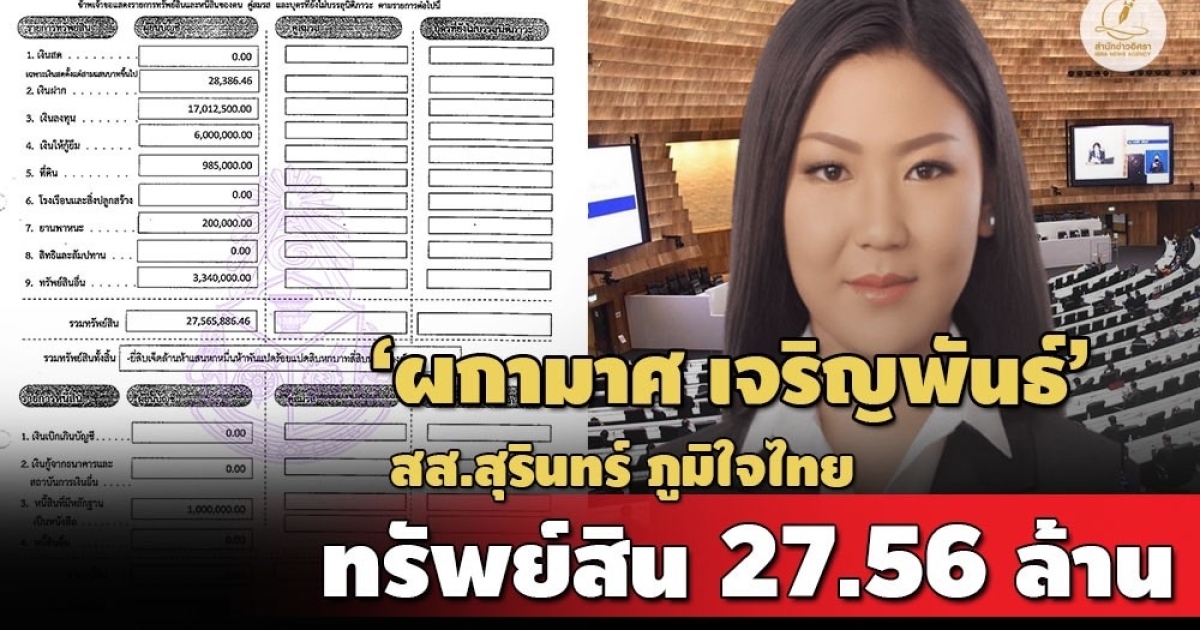 โดย น.ส.ผกามาศ แจ้งมีทรัพย์สินทั้งสิ้น 27,565,886 บาท ประกอบด้วย เงินฝาก 28,386 บาท ทั้งหมด 5 บัญชี