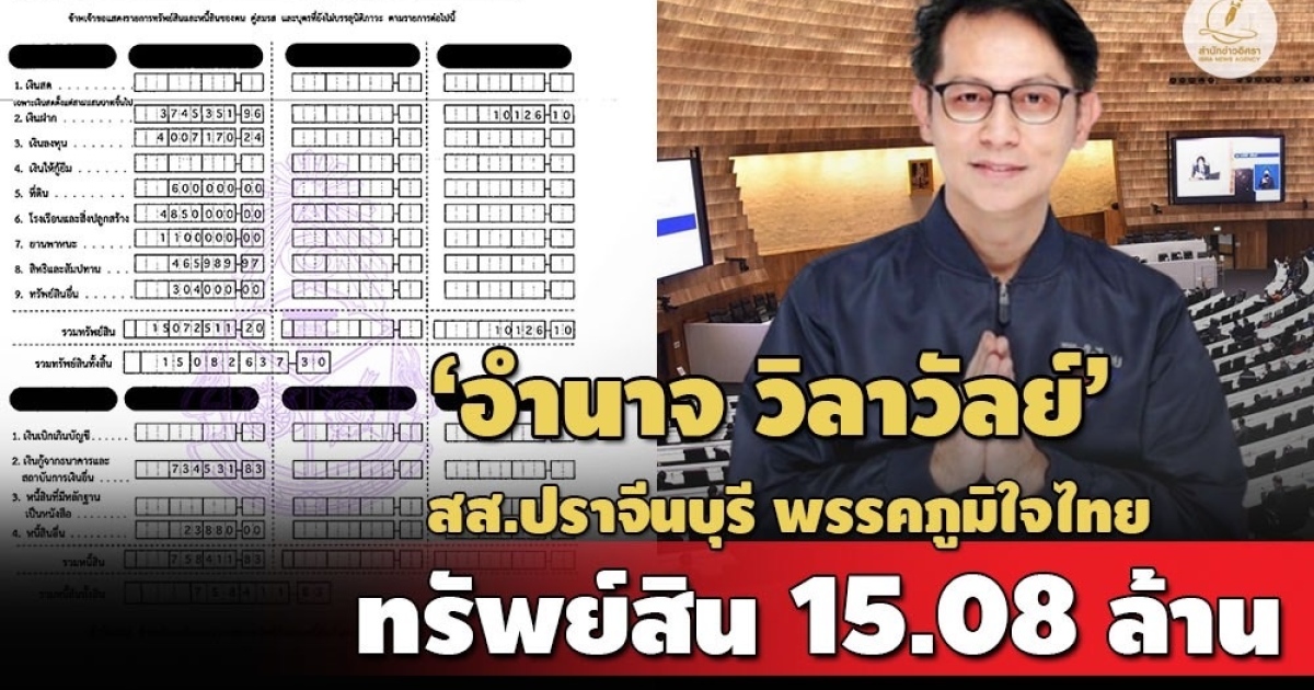 ป.ป.ช.เปิดบัญชีทรัพย์สิน 'อำนาจ วิลาวัลย์' สส.ปราจีนบุรี พรรคภูมิใจไทย ทรัพย์สินกว่า 15 ล้าน มีเงินฝาก 3.7 ล้าน มีทาวน์เฮ้าส์ -อาคารพานิชย์-บ้านไม้ สะสมทองทำแท่งหนัก 10 บาท รายได้ 2.6 ล./ปี